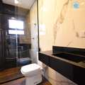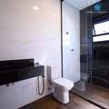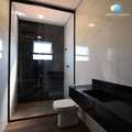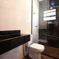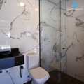 O banheiro se diferencia ainda mais com o box de vidro que vai até o teto, um elemento que combina design e praticidade.