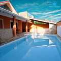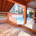 No exterior, a piscina com cascata é o ponto alto da casa, proporcionando momentos inesquecíveis de lazer e relaxamento para toda a família.