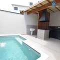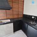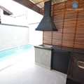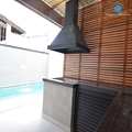 🔰A churrasqueira moderna e pia de apoio ficam sob um charmoso pergolado com cobertura em vidro e bambu, garantindo charme e proteção.